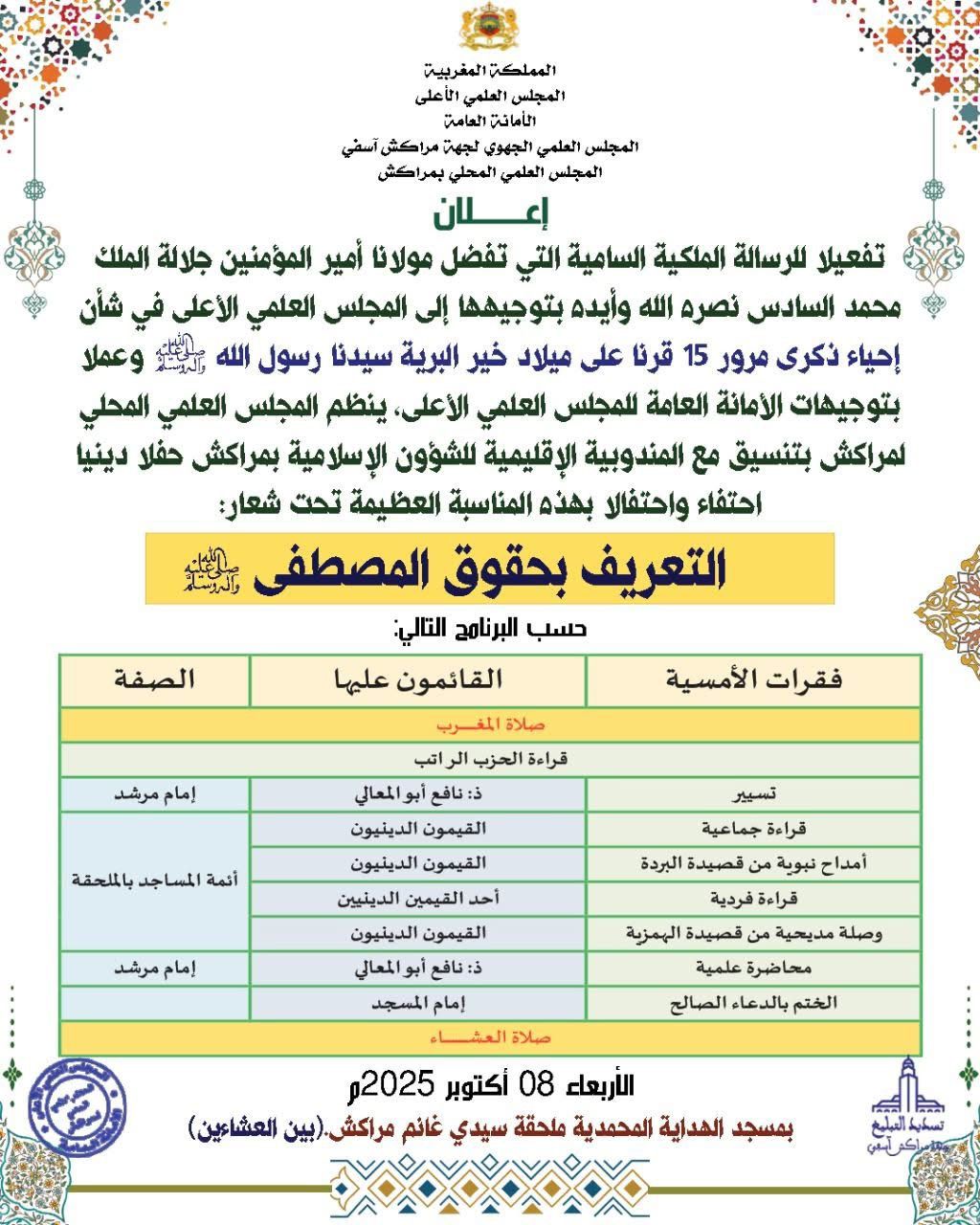 في سياق اللقاءات العلمية، وتنزيلا لخطة تسديد التبليغ، وتفعيلًا لضمامين الرسالة الملكية السامية في شأن الاحتفال بمرور خمسة عشر قرنًا على ميلاد الرسول الأعظم ﷺ، ينظم المجلس العلمي لإقليم اليوسفية بتنسيق مع مندوبية الشؤون الإسلامية ندوة علمية في موضوع: