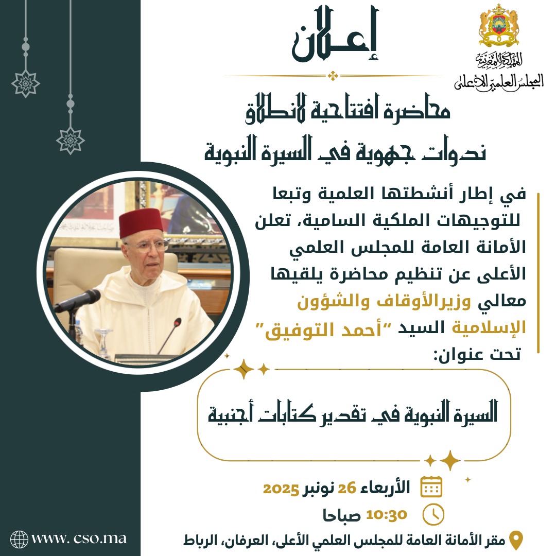 ندوة خاصة على ضوء الرسالة الملكية السامية في شأن الإحتفال بمرور 15 قرنا على ميلاد الرسول صلى الله عليه وسلم يقدمها الأستاذ محمد التهامي الحراق عضو المجلس المحلي لسلا، والأستاذ هشام السعيدي عضو المجلس العلمي المحلي لمراكش تعريف عموم الناس بما أجاد فيه المغاربة من صياغة غرر المديح النبوي تعبيرا…