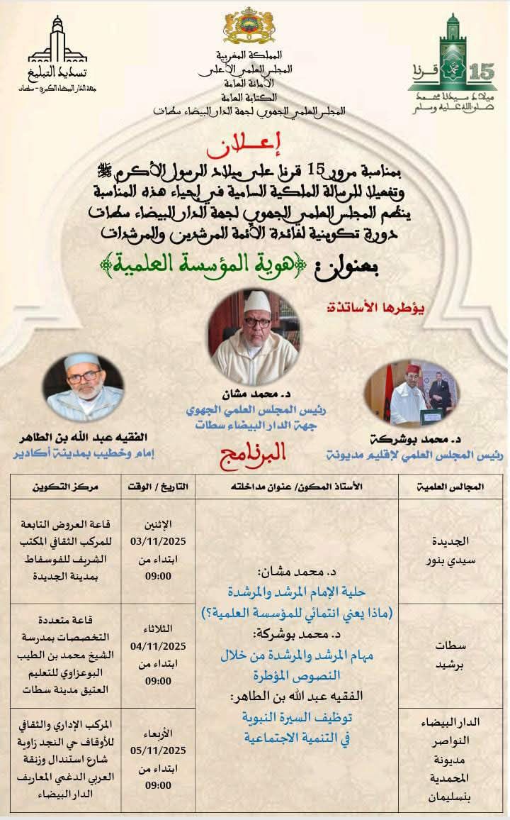 ينظم المجلس العلمي الجهوي لجهة الدار البيضاء سطات دورة تكوينية لفائدة الأئمة المرشدين والمرشدات بعنوان: “هوية المؤسسة العلمية”